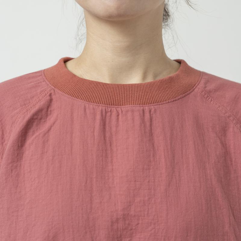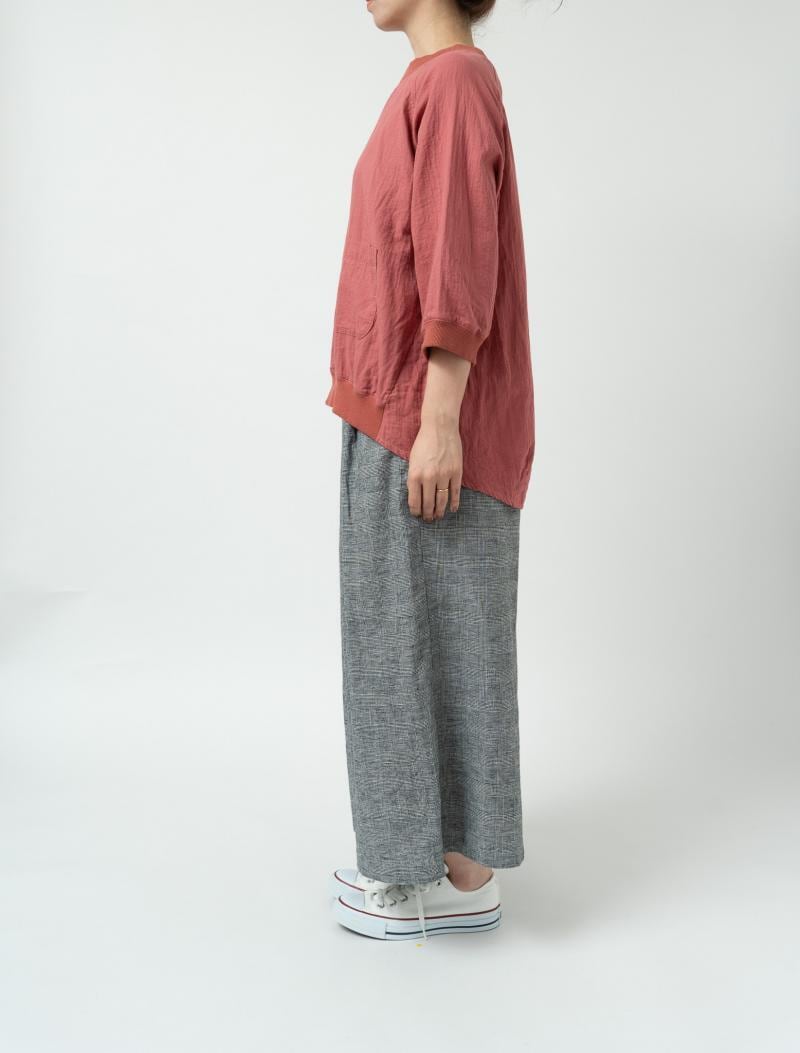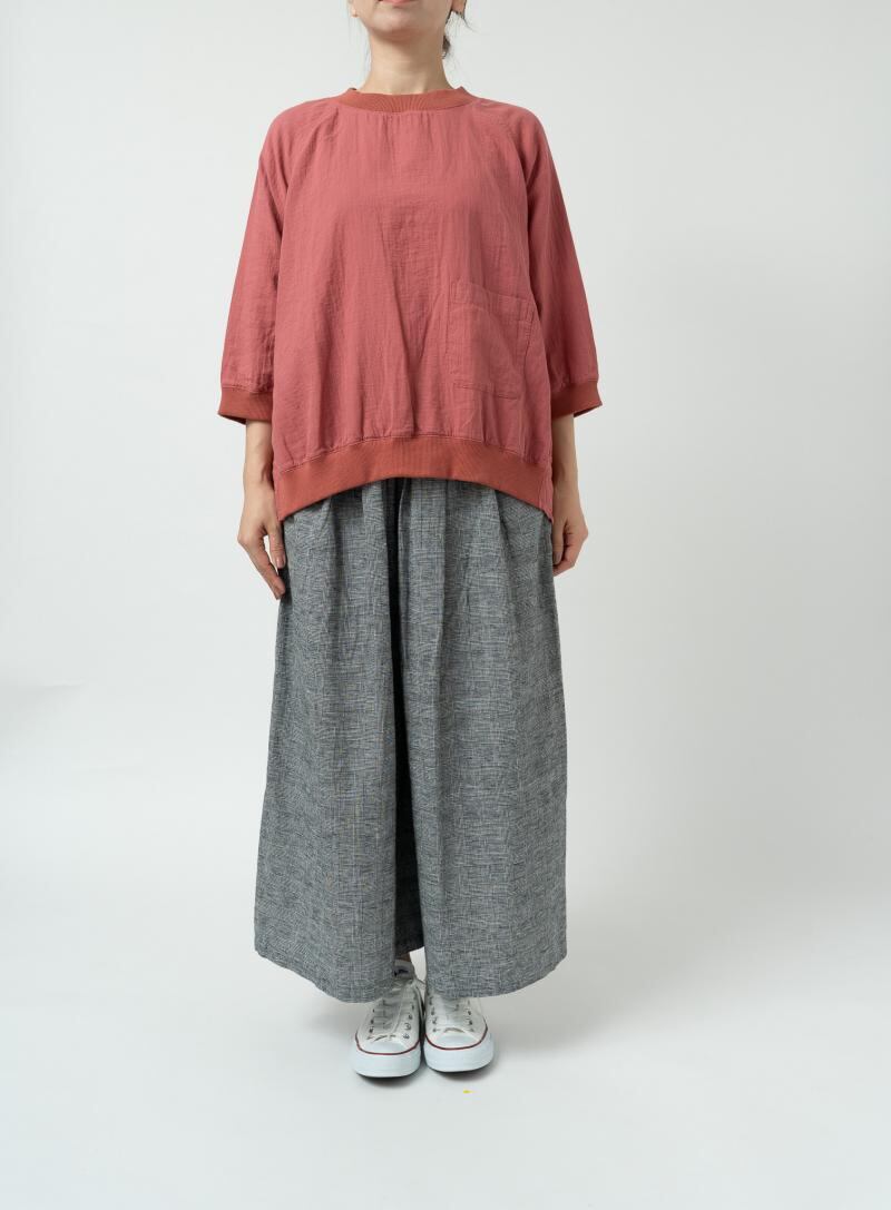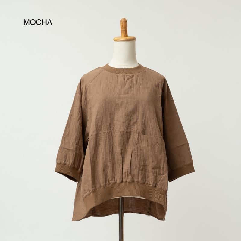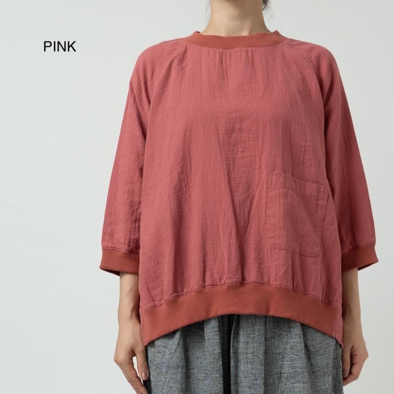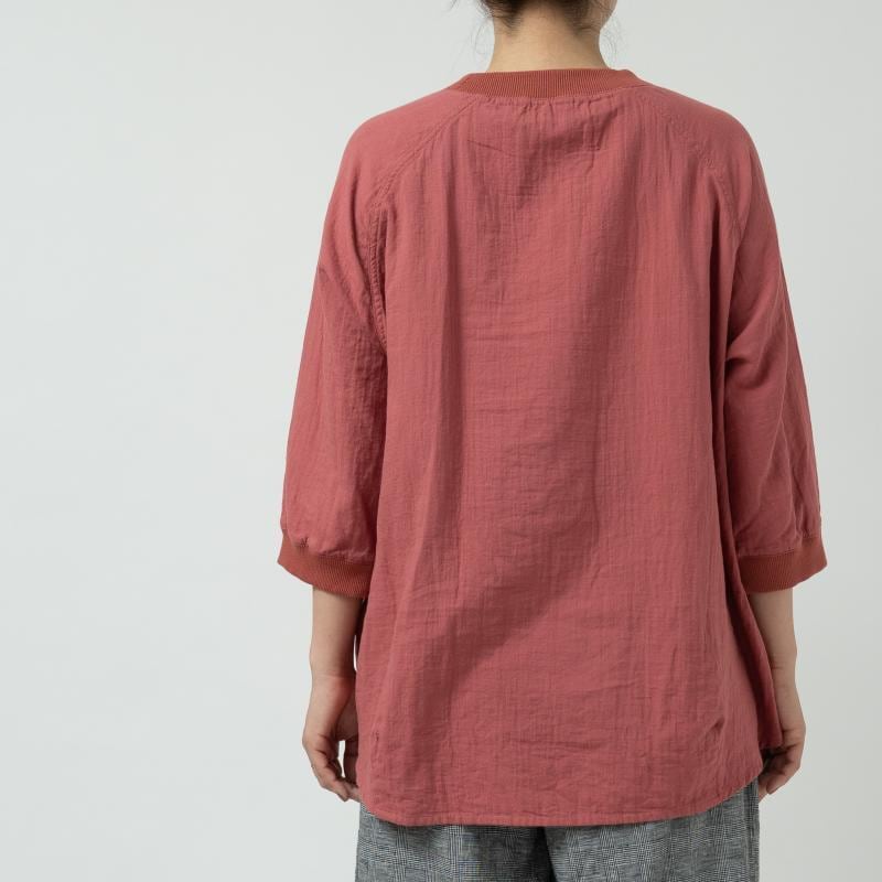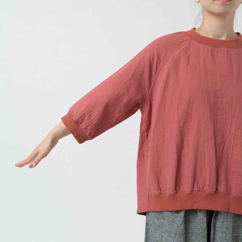 Wガーゼ リブ衿パッチポケット7分袖プルオーバーシャツ