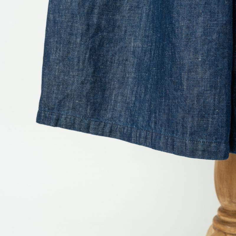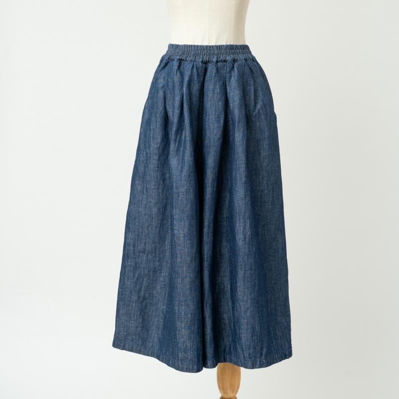 リネン素材のナチュラルな風合いとデニムのカジュアルさが融合した、上品でオシャレな一枚。腰回りはゆったり、裾に向かって広がるガウチョデザインで、足元をスッキリ見せつつも動きやすさも抜群です。