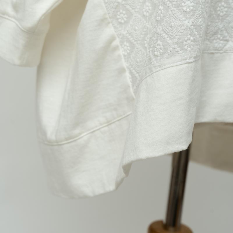 フロント身頃部分に柄刺繍を施した布帛素材を使用、