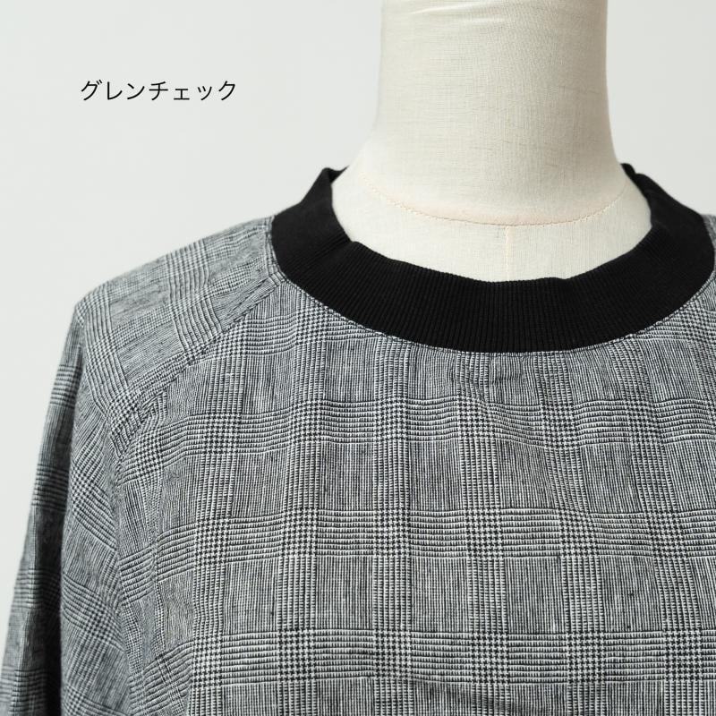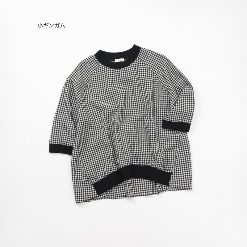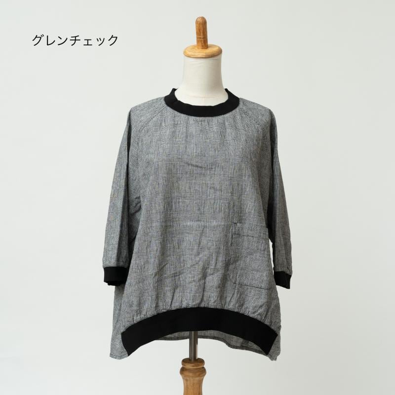 綿麻先染めチェック衿リブパッチポケット7分袖プルオーバーシャツ